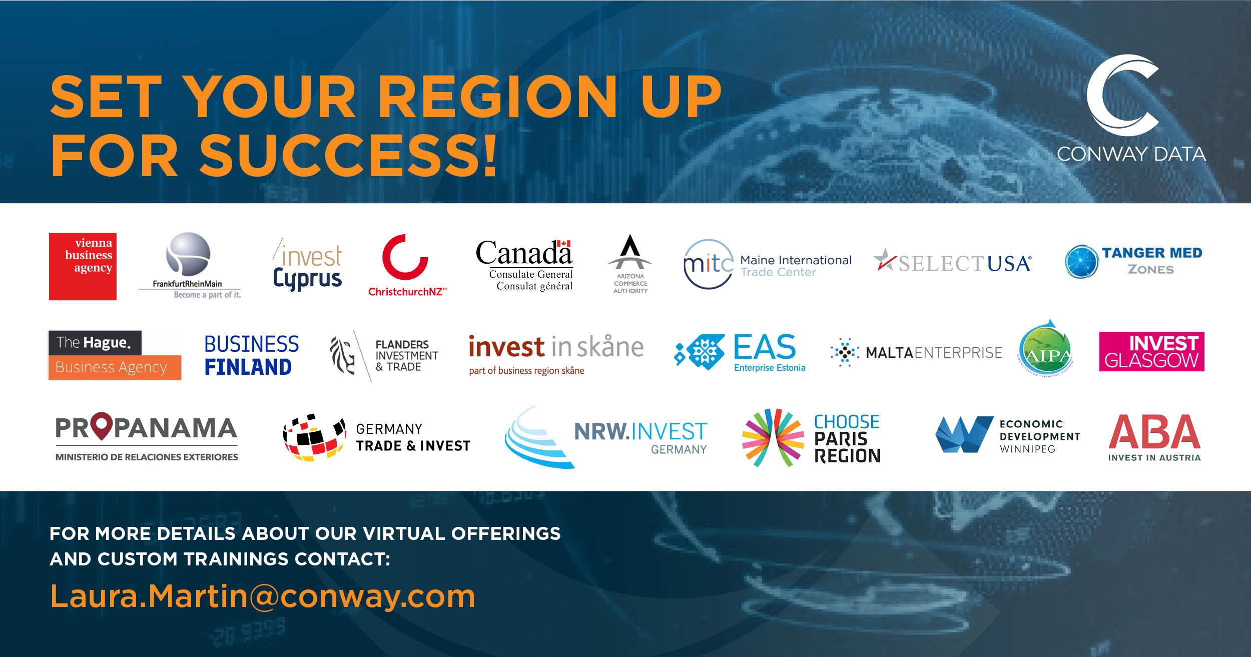 Conway Data, Inc. is a world class organizer of economic development trainings & events. Our event division has organized specialized economic development events for more than five decades, bringing together foreign investors and the Investment Promotion Agencies (IPAs) and Economic Development Organizations (EDOs) that serve them.
